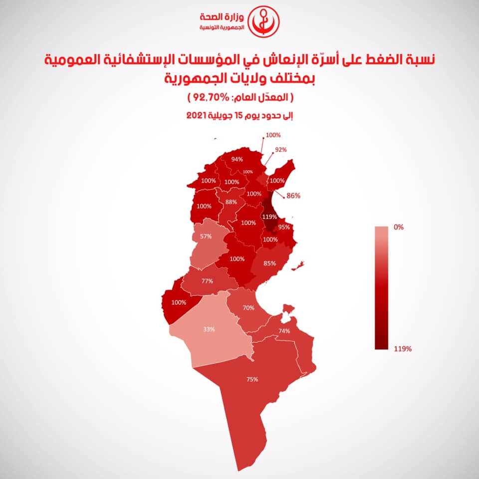 Ainsi la carte publiée par le ministère montre un taux d’occupation de 100% des services de réanimation dans dix gouvernorats dont Le Kef, Jendouba, Béjà, et Nabeul. A Sousse, ce taux s’est établi à un catastrophique 119%. S’agissant des lits d’oxygène, cinq gouvernorats affichent des taux d’occupation supérieur à 100%, dont Sidi Bouzid, La Manouba et Nabeul. Mercredi et jeudi, la Tunisie a reçu des aides médicales d’autres pays dont l’Arabie saoudite, l’Algérie, la Turquie, les Emirats arabes unis, le Qatar, l’Egypte et la Mauritanie.