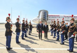 Le président de la République tunisienne Kaïs Saïed est arrivé à Paris en fin d’après-midi où il fut accueilli à sa descente de l’avion Tunisair par Jean-Yves Le Drian, ministre français de l’Europe et des Affaires étrangères. En début de soirée, il fut reçu par son homologue Emmanuel Macron à l’Elysée.