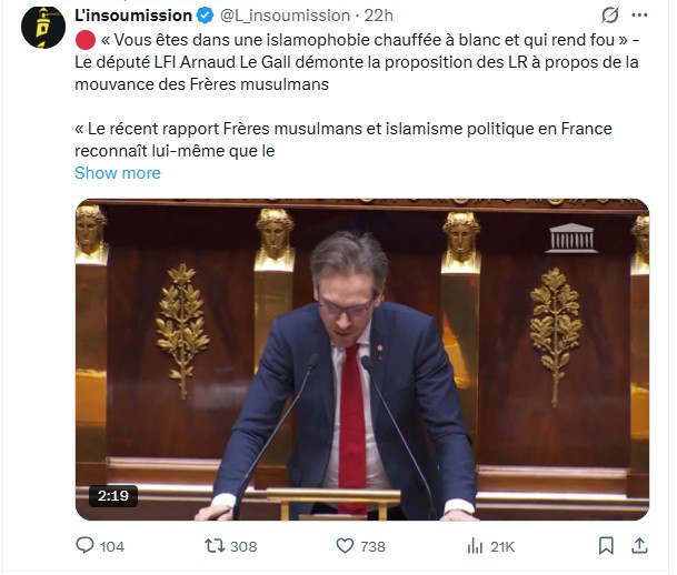 Pour Arnaud Le Gall, député LFI du Val D’Oise, la droite et l’extrême-droite ont voté un texte islamophobe : « La proposition LR visant à classer les frères musulmans comme organisation terroriste ne sert pas la lutte contre le terrorisme. Elle s’inscrit en revanche dans une islamophobie chauffée à blanc (…) Voir des terroristes partout, voilà le plus sûr moyen d’affaiblir la lutte contre le terrorisme en sapant l’unité de la nation ».