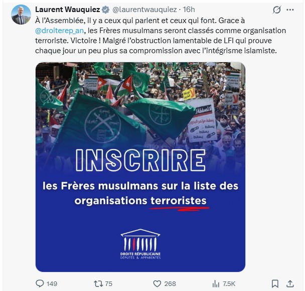 « À l’Assemblée, il y a ceux qui parlent et ceux qui font. Grâce à LR, les Frères musulmans seront classés comme organisation terroriste (…) Malgré l’obstruction lamentable de LFI qui prouve chaque jour un peu plus sa compromission avec l’intégrisme islamiste », se félicitait Laurent Wauquiez, député LR de la Haute-Loire, hier (22 janvier) sur X.