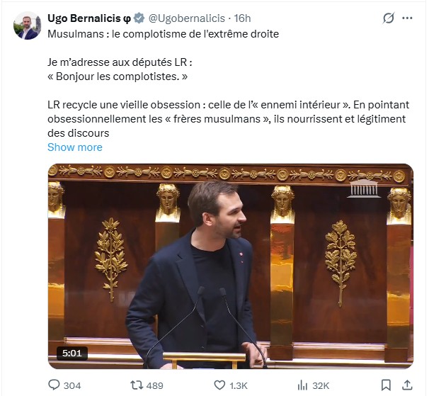« Je dénonce l’absurdité de l’islamophobie véhiculée par LR et RN ! (…) Sous couvert de lutte contre le séparatisme, ces discours pointent un ennemi intérieur, rappelant les heures les plus sombres de notre histoire », réagissait Ugo Bernalicis, député LFI du Nord, sur X hier.