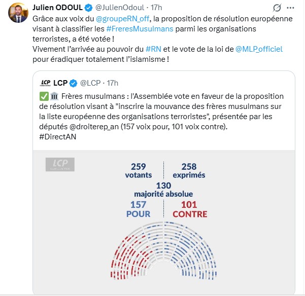 Julien Odoul, député RN de l’Yonne, se félicitait de cette victoire contre « l’islamisme » : « Grâce aux voix du RN, la proposition de résolution européenne visant à classifier les Frères musulmans parmi les organisations terroristes, a été votée ! Vivement l’arrivée au pouvoir du RN et le vote de la loi de Marine Le Pen pour éradiquer totalement l’islamisme ».