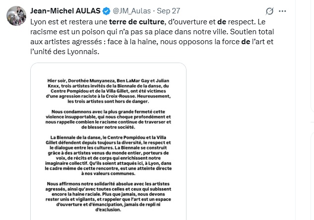 Le maire de Lyon Grégory Doucet a également condamné l’agression raciste et assuré les trois artistes de « son soutien et sa solidarité ». « Lyon est et restera une terre de culture, d’ouverture et de respect. Le racisme est un poison qui n’a pas sa place dans notre ville », a aussi réagi sur X Jean-Michel Aulas, qui vient de se lancer dans la course aux municipales.
