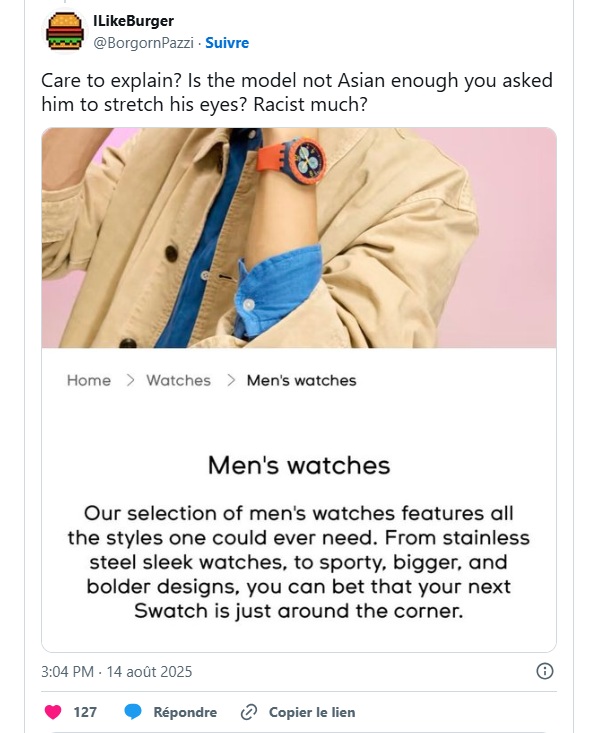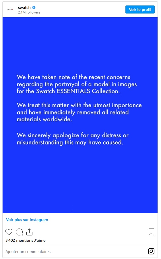 Dans un message publié sur Instagram et sur le réseau social chinois Weibo, Swatch a reconnu les « récentes préoccupations concernant la représentation d’un mannequin » dans cette publicité. L’entreprise a ainsi décidé de la supprimer : « Nous nous excusons sincèrement pour toute détresse ou tout malentendu que cela a pu causer. »