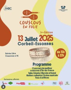 Et ça, à Corbeil-Essonnes, ils l’ont bien compris. Le dimanche 13 juillet 2025, cette ville de l’Essonne ne sera pas seulement le point de départ du pont du 14 juillet ou un arrêt du RER D. Non, ce jour-là, elle sera le centre névralgique du bon goût et du bon vivre, en accueillant la toute première édition de “Couscous en Folie”. Un festival à la gloire du roi de la semoule et de la merguez. Gratuit, ouvert à tous, avec une promesse : celle de se régaler sans se ruiner.