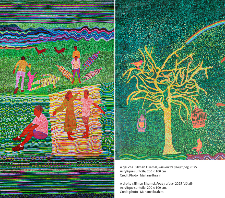 Né il y a une quarantaine d’années à Sidi Bouzid, en Tunisie, Slimen Elkamel, formé à l’Institut supérieur des beaux-arts de Tunis, n’a jamais renié ses origines rurales et populaires. Cet héritage irrigue son œuvre haute en couleurs, nourrie des contes et des imaginaires de l’enfance.