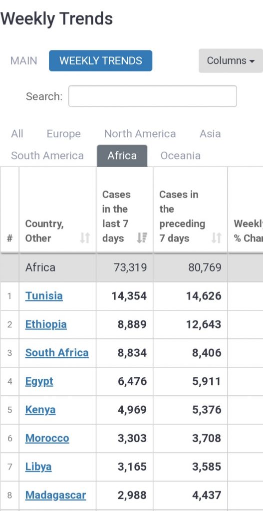 La Tunisie est bien en revanche la première, selon Worldometer, classée première en Afrique concernant l’évolution hebdomadaire des cas de coronavirus, comme l’indique le tableau ci-dessous.