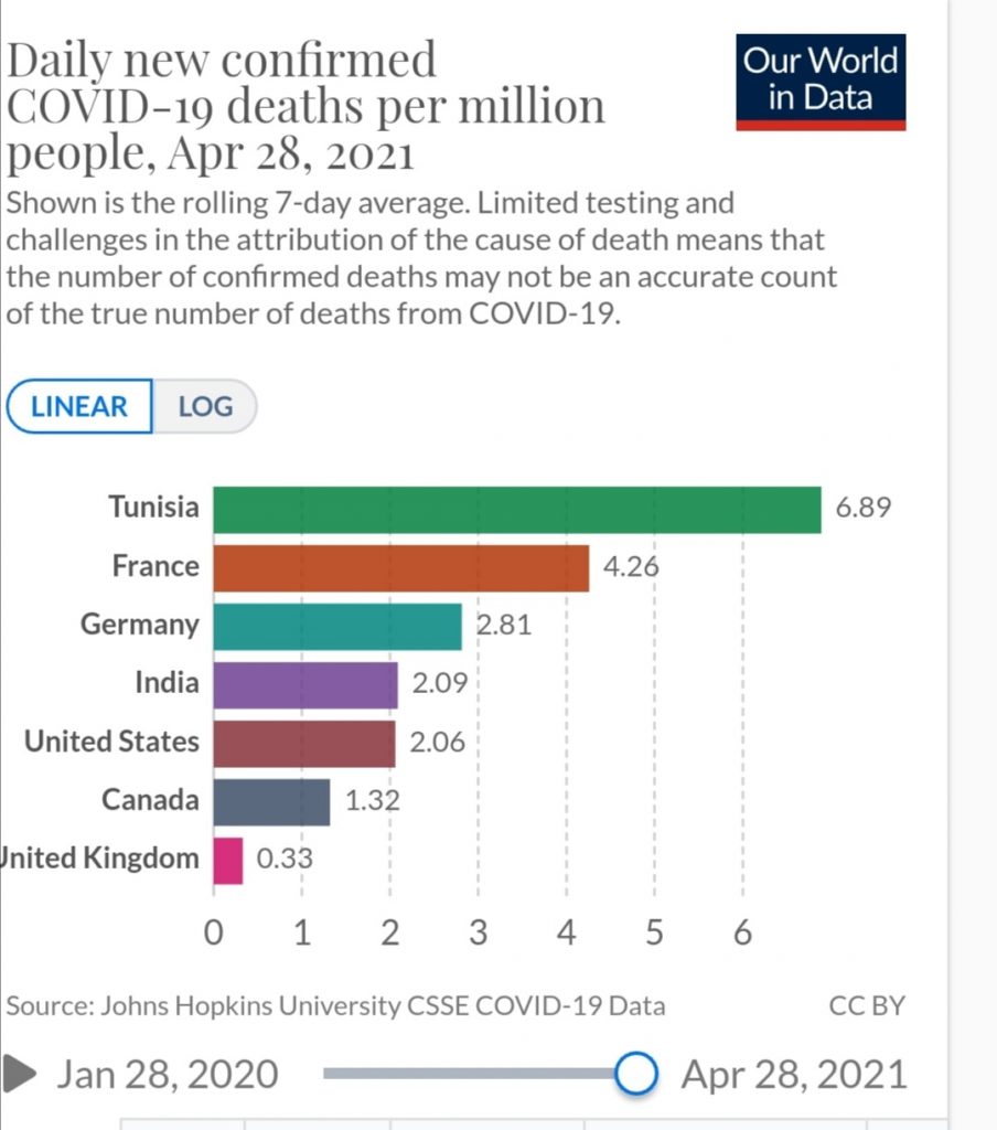 D’après les statistiques de la prestigieuse Université de médecine Johns-Hopkins, la Tunisie occupe aujourd’hui une bien tragique pôle position en termes de décès sur le plan mondial, apprend-on jeudi, avec 6.89 décès quotidiens par million d’habitants. Le pays est ainsi loin devant la France (4.26), l’Allemagne (2.81), ou encore l’Inde (2.09), comme le montrant le graphique ci-dessous.