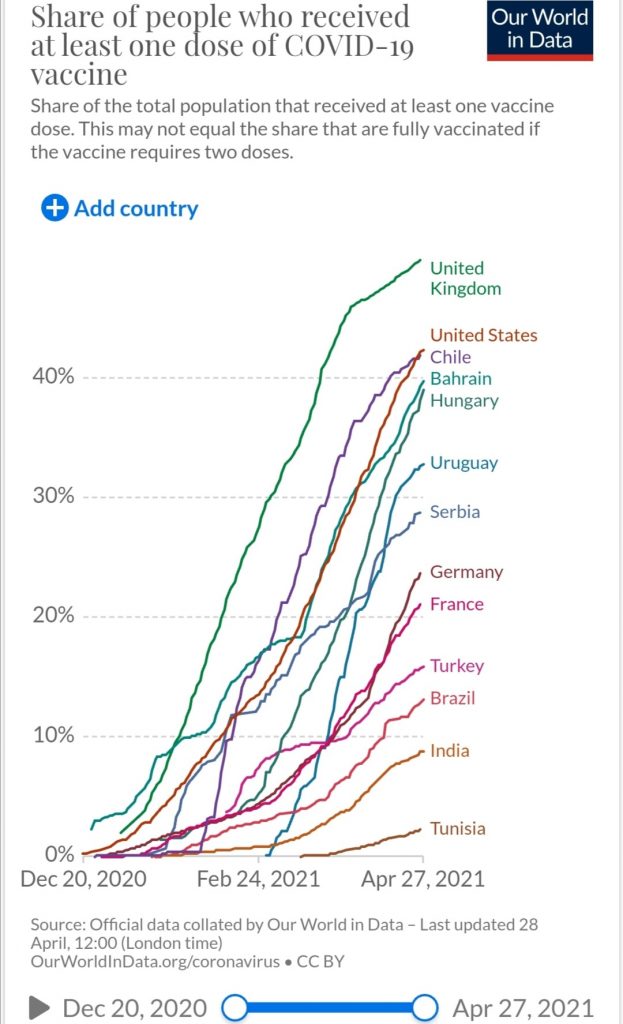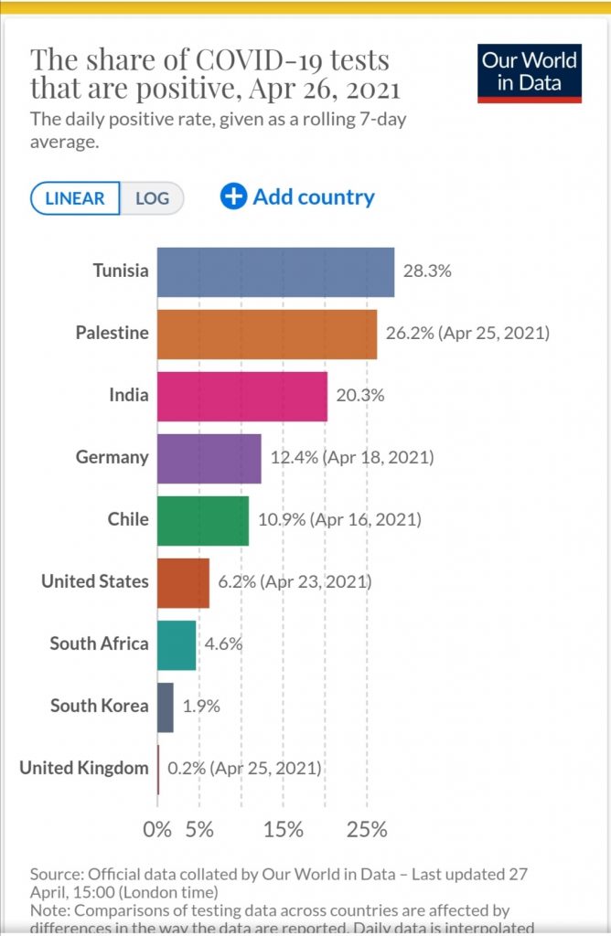 On retrouve la même tendance au niveau des contaminations : le 26 avril 2021, le nombre de Tunisiens contaminés a augmenté de 28,3%, loin devant la Palestine, l’Inde, l’Allemagne ou la Chine.