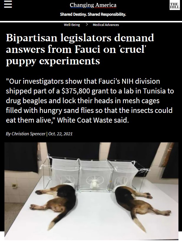 « Nos enquêteurs montrent que la division National Institutes of Health (NIH) de Fauci a envoyé une partie d’une subvention de 375.800 $ à un laboratoire en Tunisie pour droguer des beagles et placer leurs têtes dans des cages grillagées remplies de phlébotomes affamés afin que les insectes puissent les manger vivants », a déclaré White Coat Waste. « Ils ont également enfermé des beagles seuls dans des cages dans le désert pendant la nuit durant neuf nuits consécutives pour les utiliser comme appâts pour attirer les phlébotomes infectieuses ».