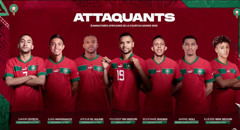 Attaquants: Hakim Ziyech (Galatasaray/Turquie), Ilyas Akhomach (Villarreal/Espagne), Ayoub El Kaabi (Olympiakos/Grèce), Youssef En-Nesyri (FC Séville/Espagne), Soufiane Rahimi (Al Aïn/Emirats arabes Unis), Amine Adli (Bayer Leverkusen/Allemagne), Eliesse Ben Seghir (AS Monaco/France).