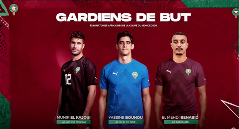 Gardiens de but: Yassine Bounou (Al Hilal/Arabie Saoudite), Mounir El Kajoui (Al Wehda FC/Arabie Saoudite), El Mehdi Benabid (AS FAR)