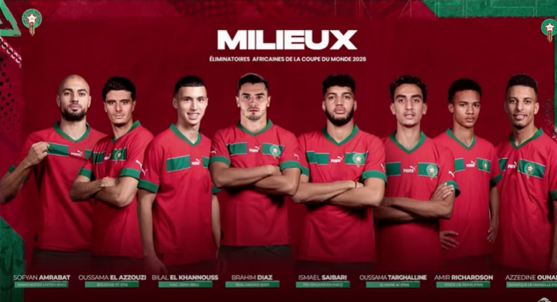 Milieux de terrain: Sofyan Amrabat (Manchester United/Angleterre), Oussama El Azzouzi (Bologne FC/Italie), Bilal El Khannouss (Genk/Belgique), Ibrahim Diaz (Real Madrid/Espagne), Ismael Saibari (PSV Eindhoven/Pays-bas), Oussama Targhalline (Le Havre/France), Amir Richardson (Stade de Reims/France), Azzedine Ounahi (Olympique Marseille/France).