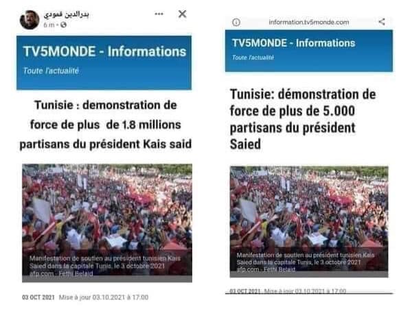 Dimanche soir, un montage grossier (où l’on peut compter quelques fautes d’orthographe) détourne la page de TV5 Monde pour remplacer le chiffre de 5000 par celui d’1,8 million. Très vite, l’intox se propage sur Facebook d’autant plus qu’elle est reprise par le député Badreddine Gammoudi du parti nationaliste Echaâb, formation alliée du président.