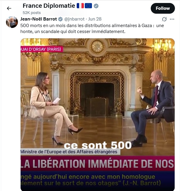 Samedi 28 juin, Jean-Noël Barrot, ministre des Affaires étrangères, exprimait sa « colère » face à ces morts civiles aux points de distribution alimentaire et annonçait que la France était « prête, l’Europe aussi, à concourir à la sécurité des distributions alimentaires » dans le territoire palestinien de Gaza en guerre.