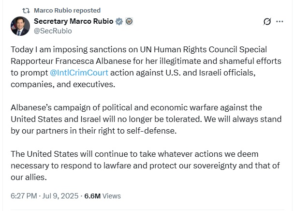 « La campagne de guerre politique et économique d’Albanese contre les États-Unis et Israël ne sera plus tolérée », avertissait hier (9 juillet) sur X Marco Rubio, chef de la diplomatie américaine. Dans le viseur des États-Unis : la Rapporteure spéciale de l’ONU pour les Territoires palestiniens, Francesca Albanese.