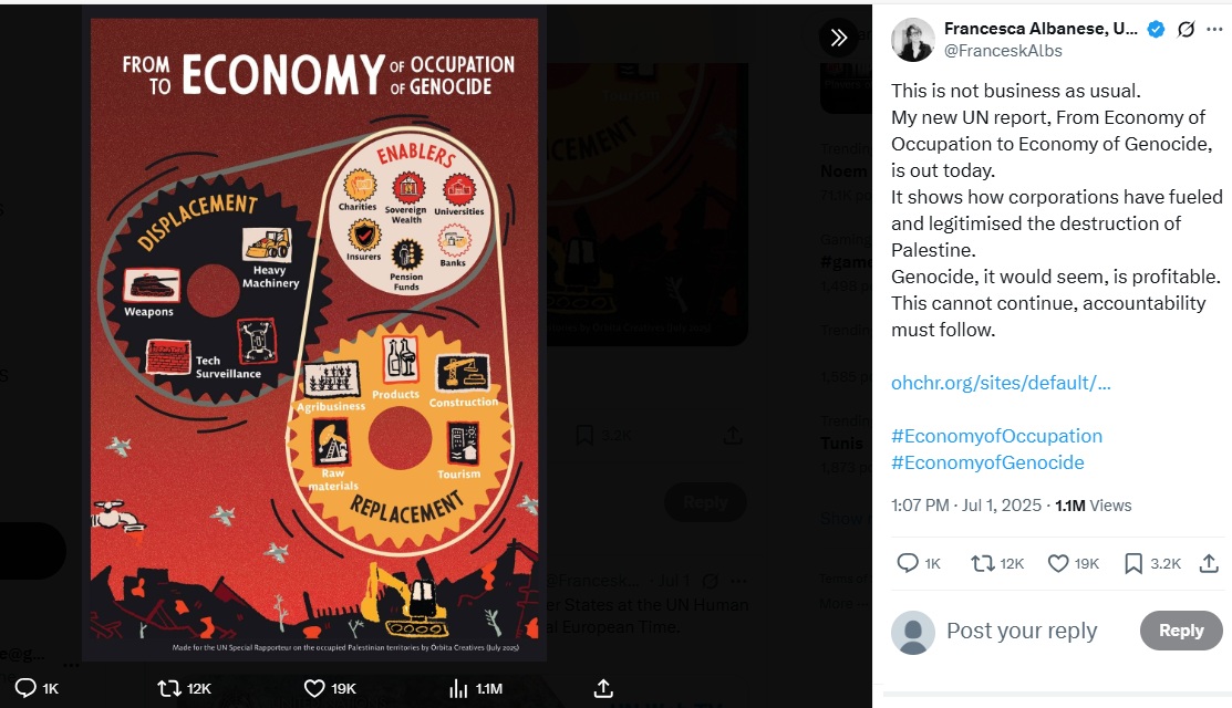 « Il montre comment les entreprises ont alimenté et légitimé la destruction de la Palestine. Le génocide, semble-t-il, est rentable. Cela ne peut pas continuer, l’obligation de rendre des comptes doit désormais être imposée », expliquait Francesca Albanese sur X (1er juillet).