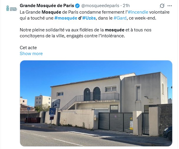 La Grande mosquée de Paris a également envoyé un message de solidarité via le réseau social X (7 octobre) : « La Grande Mosquée de Paris condamne fermement l’#incendie volontaire qui a touché une mosquée d’Uzès, dans le Gard, ce week-end. Notre pleine solidarité va aux fidèles de la mosquée et à tous nos concitoyens de la ville, engagés contre l’intolérance ».