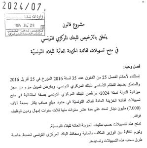 L’article en question soumis au vote à l’Assemblée des représentants du peuple (ARP) stipule qu’il s’agit d’une exception aux dispositions de l’article 25 de la loi portant fixation du statut de la BCT et qu’en vue de financer une partie du déficit du budget de l’État pour l’année 2024, « la Banque centrale est autorisée exceptionnellement à accorder des facilités au trésor public de l’Etat à hauteur d’un montant net d’une valeur de 7.000 millions de dinars remboursé sur dix ans, avec une période de grâce de trois ans, le tout sans intérêts »…