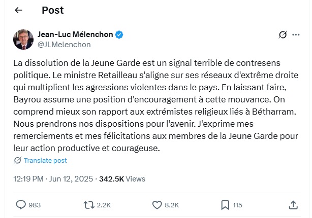 Jean-Luc Mélenchon accuse Bruno Retailleau de « s’aligner sur les réseaux d’extrême droite » qui « multiplient les agressions violentes dans le pays ». Cette décision est « un signal terrible de contre-sens politique », a tweeté le leader de LFI. Jean-Luc Mélenchon s’en est également pris au Premier ministre : « en laissant faire », a-t-il écrit, François Bayrou « assume une position d’encouragement à cette mouvance ». « On comprend mieux son rapport aux extrémistes religieux liés à Bétharram », a-t-il cinglé.