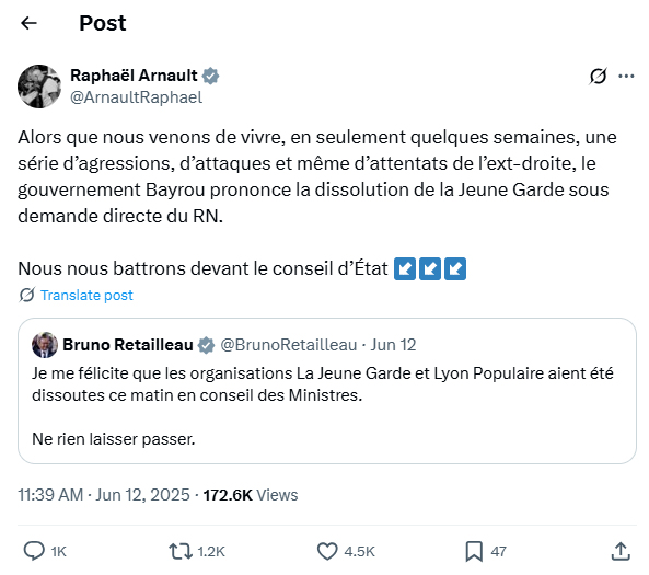 « Face à l’ensauvagement de la société dont nous constatons chaque jour les conséquences dramatiques », a déclaré Bruno Retailleau, « l’Etat ne saurait tolérer que de tels groupements continuent à exalter impunément la haine et la violence, quelle que soit leur orientation politique ou idéologique ».