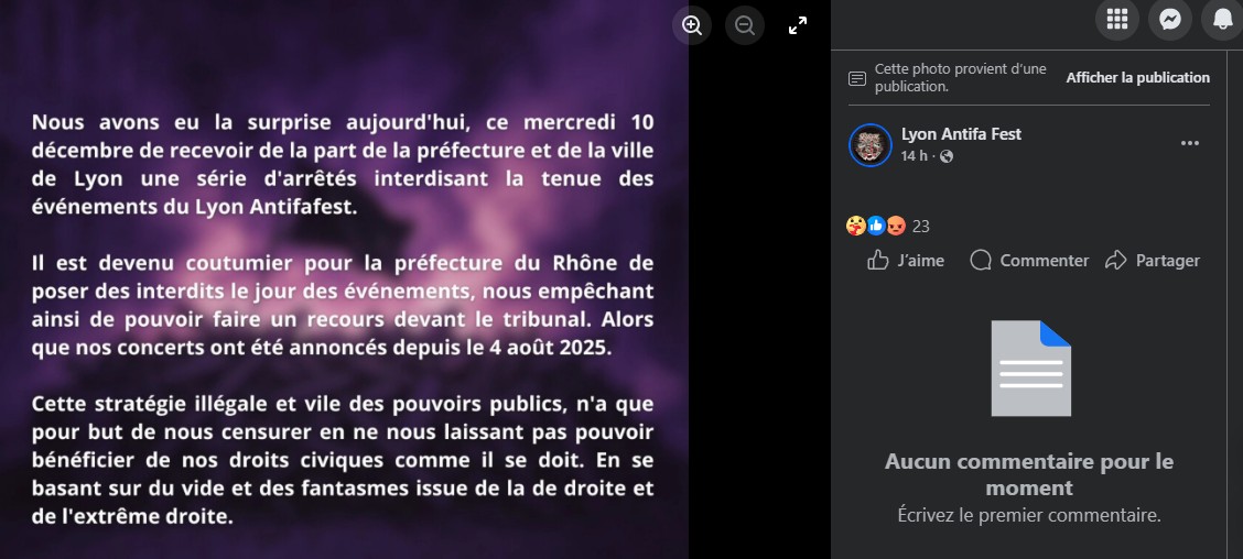 « Ce festival peut-être un catalyseur de plusieurs agissements violents et de troubles graves à l’ordre public lors d’affrontements », détaille la préfecture, précisant qu’il existe « un antagonisme récurrent et violent entre la mouvance d’ultra-gauche et la mouvance d’ultra-droite. Dans ces circonstances, l’interdiction des concerts des 11, 12, et 13 décembre apparaît adaptée et nécessaire ».