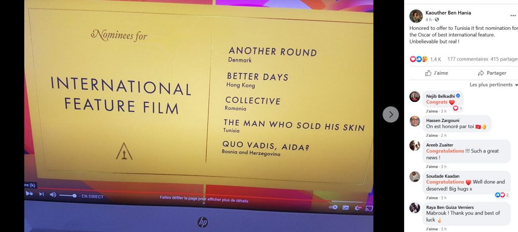 « Je suis honorée d’offrir à la Tunisie sa première nomination aux Oscars pour la catégorie best international feature. Je vis un rêve éveillé ! », a aussitôt réagi Kaouther Ben Hania. Originaire de Sidi Bouzid, la réalisatrice s’était notamment fait connaître via « La belle et la meute », primé à Cannes en 2017.