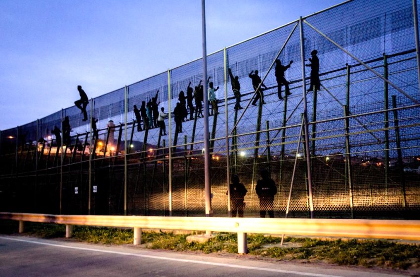 Des migrants subsahariens accrochés à la clôture métallique qui sépare le Maroc du préside occupé de Melilla. Laura Tárraga Garrido / NurPhoto / NurPhoto via AFP