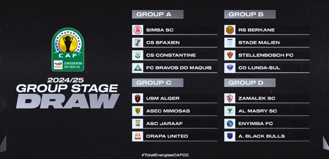 Selon le tirage au sort, le groupe A comprend les clubs tanzanien de Simba, tunisien du CS Sfaxien, algérien du CS Constantine et angolais de Onze Bravos, tandis que le groupe C est formé des clubs de l’USM Alger (Algérie), de l’ASEC Mimosas (Côte d’Ivoire), de l’ASC Jaraaf (Sénégal) et d’Orapa United FC (Botswana).