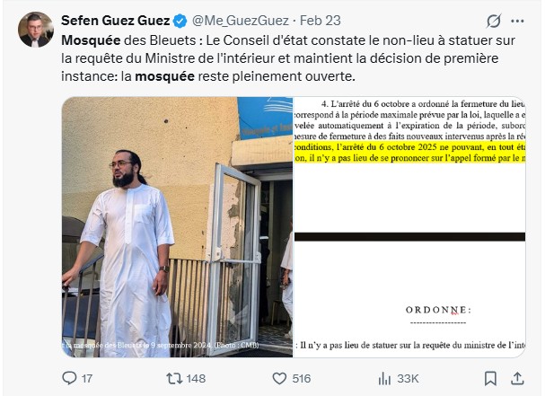 Sefen Guez Guez, un des avocats de l’Institut musulman des Bleuets se satisfaisait de ce cette décision sur X (23 février) : « Le Conseil d’état (…) maintient la décision de première instance: la mosquée reste pleinement ouverte ».