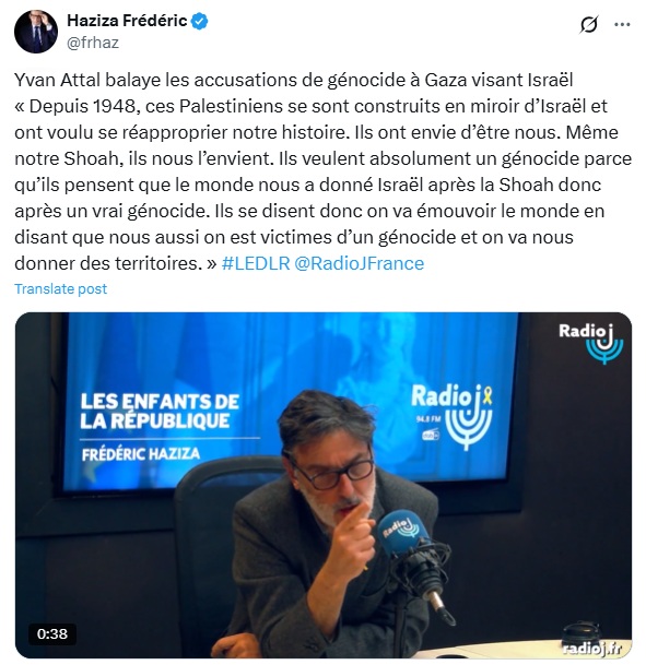 D’après lui, les Palestiniens auraient construit leur identité en « miroir d’Israël » et voudraient « se réapproprier l’histoire juive ». Il va jusqu’à dire qu’ils espèrent un génocide, persuadés qu’Israël a été créé ainsi après la Shoah, et qu’en se présentant comme victimes, ils obtiendraient des territoires. Comme si leur souffrance relevait d’un calcul cynique plutôt que des conséquences du conflit et de l’occupation.