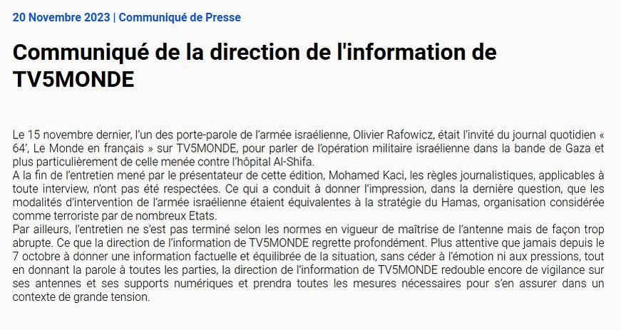 C’est une première et on espère que ce sera une dernière ! Lundi 20 novembre, la chaîne TV5MONDE a publiquement « regretté » la façon dont son journaliste Mohamed Kaci a conduit un entretien avec un porte-parole de l’armée israélienne, Olivier Rafowicz, le 15 novembre.