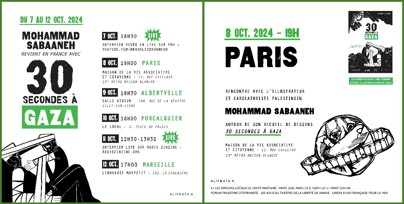 Mohammad Sabaaneh fait une tournée en France, du 7 au 12 octobre. Il sera le 8 à Paris pour la publication de sa nouvelle bande dessinée « 30 secondes à Gaza ».