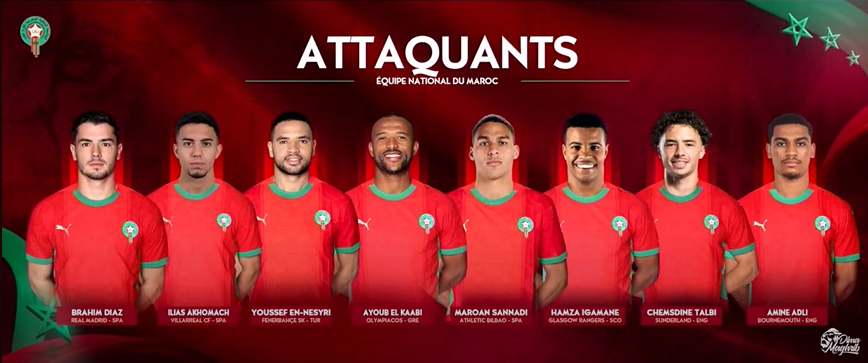 – Attaquants : Brahim Diaz (Real Madrid), Chemseddine Talbi (Sunderland/Angleterre), Youssef En-Nesyri (Fenerbahçe/Turquie), Hamza Igamane (Glasgow Rangers/Écosse), Marouane Sanhaji (Athletic Bilbao/Espagne), Ayoub El Kaabi (Olympiakos/Grèce), Amine Adli (Bournemouth/Angleterre), Ilias Akhomach (Villarreal/Espagne).
