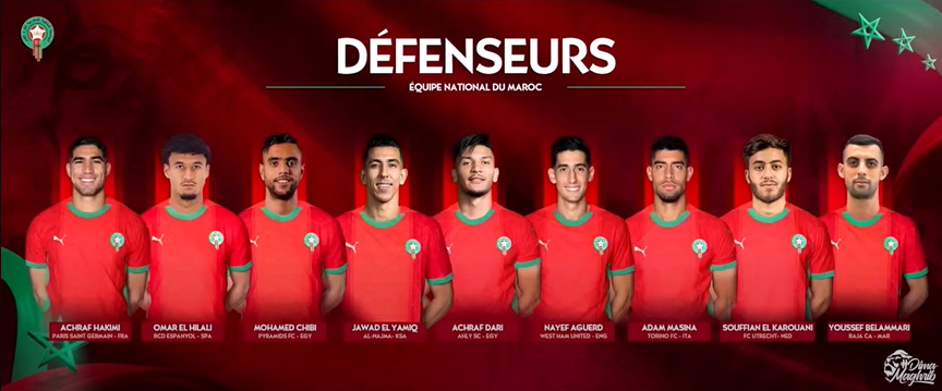 – Défenseurs : Achraf Hakimi (Paris Saint-Germain), Omar El Hilali (RCD Espanyol/Espagne), Soufiane El Karouani (FC Utrecht/Pays-Bas), Nayef Aguerd (West Ham United/Angleterre), Achraf Dari (Al Ahly/Égypte), Adam Masina (Torino/Italie), Jawad El Yamiq (Al-Najma/Arabie Saoudite), Mohamed Chibi (Pyramids/Égypte), Youssef Belammari (Raja Casablanca).