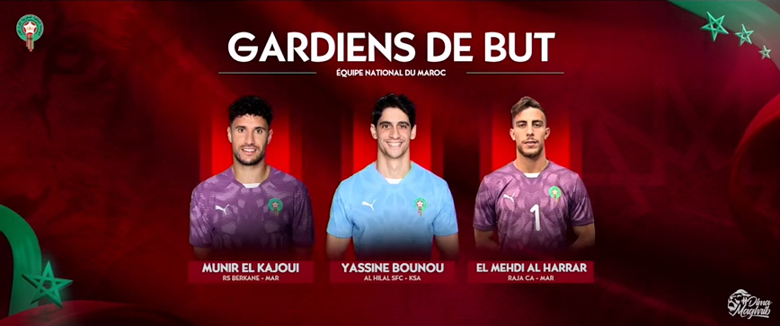– Gardiens de but : Mounir El Kajoui (Renaissance Berkane), Yassine Bounou (Al Hilal/Arabie Saoudite), Mehdi Lahrar (Raja Casablanca).