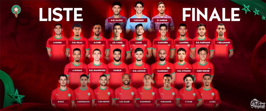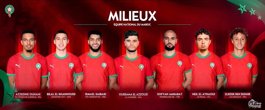 – Milieux de terrain : Azzeddine Ounahi (Olympique de Marseille/France), Bilal El Khannous (Leicester City/Angleterre), Ismaël Saibari (PSV Eindhoven/Pays-Bas), Oussama El Azzouzi (AJ Auxerre/France), Sofyan Amrabat (Fenerbahçe/Turquie), Neil El Ainaoui (AS Rome/Italie), Eliesse Ben Seghir (AS Monaco/France).