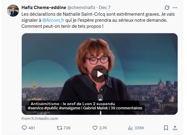 Dimanche soir, sur X, Chems-Eddine Hafiz, recteur de la Grande Mosquée de Paris, a également annoncé son intention de saisir l’Arcom, dénonçant des déclarations « extrêmement graves ».