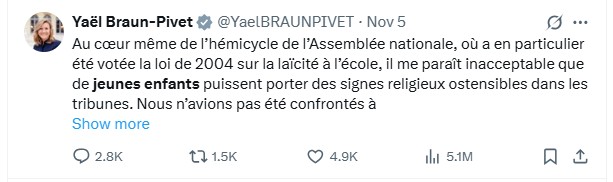 La présidente de l’Assemblée nationale lui a répondu sur X, en jugeant: « inacceptable que de jeunes enfants puissent porter des signes religieux ostensibles dans les tribunes », invoquant une « cohérence républicaine » dans le lieu où la loi de 2004 sur la laïcité à l’école a été votée.