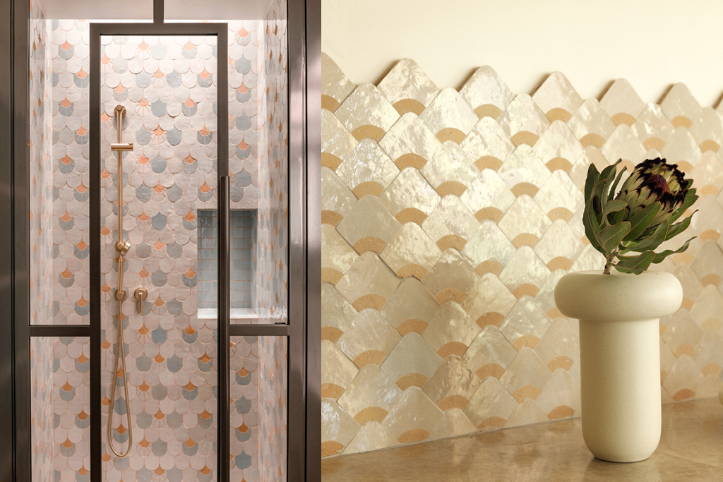 G : PLUME, l’une des créations les plus emblématiques de Salima Filali, qui évoque un plumage inspiré par le mouvement Art déco. Photo : Luca Fascini – D : Création AURORE composée de zelliges émaillés et ciselés vient dialoguer parfaitement avec les façades en bois et le plan en pierre Taj Mahal. Photo : @oracle_paris