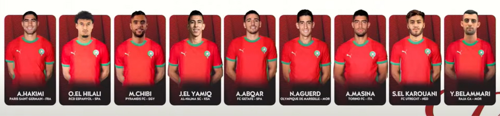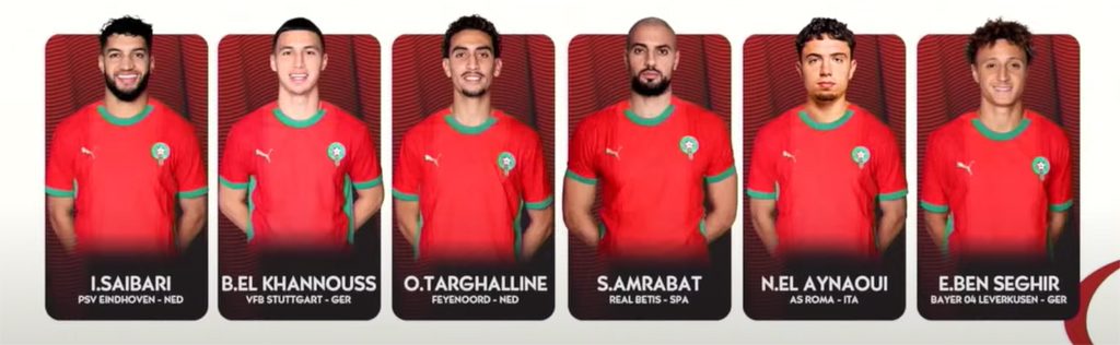 Bilal El Khannous (Stuttgart, Allemagne), Ismael Saibari (PSV Eindhoven, Pays-Bas), Oussama Targhalline (Feyenoord, Pays-Bas), Sofyan Amrabat (Betis, Espagne), Neil El Aynaoui (AS Rome, Italie), Eliesse Ben Seghir (Leverkusen, Allemagne)