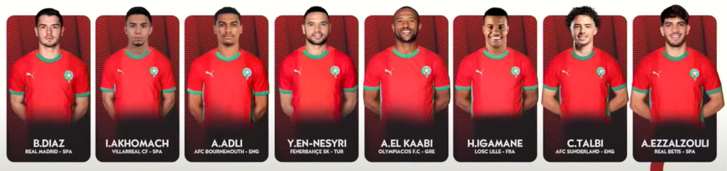 Brahim Diaz (Real Madrid, Espagne), Chemsddine Talbi (Sunderland, Angleterre), Youssef En-Nesyri (Fenerbahçe, Turquie), Hamza Igamane (Lille, France), Ayoub El Kaabi (Olympiakos, Grèce), Amine Adli (Bournemouth, Angleterre), Ilias Akhomach (Villarreal, Espagne), Abdessamad Ezzalzouli (Real Betis, Espagne)