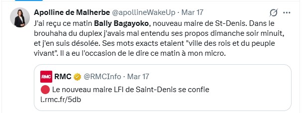 Par exemple, la journaliste de BFMTV et RMC Apolline de Malherbe a interviewé le maire de Saint-Denis sur ces mots, qu’il n’a donc pas tenus, avant de s’excuser plus tard dans la journée sur X: « dans le brouhaha du duplex j’avais mal entendu ses propos dimanche soir minuit, et j’en suis désolée ».