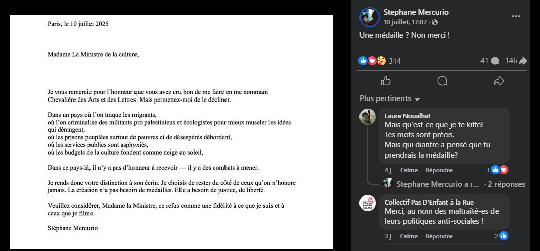 Stéphane Mercurio n’est pas la première à refuser une médaille. Mais à l’heure où le monde culturel est de plus en plus sommé de choisir son camp, entre subventions fragiles, censures feutrées et injonctions à la neutralité, son refus résonne puissamment. Elle nous rappelle que la création, la vraie, ne se porte pas autour du cou. Elle se tient debout, sans uniforme, aux côtés des damnés de la terre.