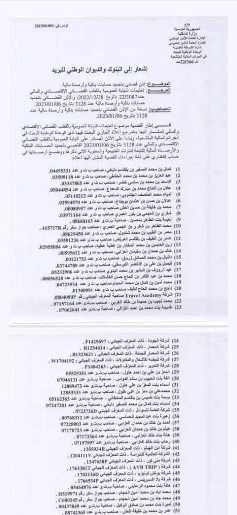 L’information avait d’abord été ébruitée une semaine à l’avance par un chroniqueur de la chaîne de télévision Attessia TV, connu pour sa proximité avec l’actuel pouvoir. Ainsi les banques privées tout comme la Poste tunisienne ont été informées le 18 janvier de cette instruction de geler les comptes et les avoirs bancaires de personnes physiques et morales, en vertu de cette décision de justice, dans le cadre d’une affaire de suspicion de blanchiment d’argent.