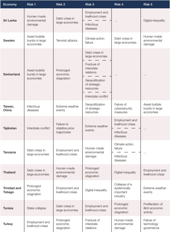 Le rapport s’attelle en particulier aux « risques les plus sévères à l’échelle mondiale au cours des dix prochaines années » à l’aune de l’actualité économique, sociétale, environnementale et technologique des pays concernés par les résultats de l’enquête.