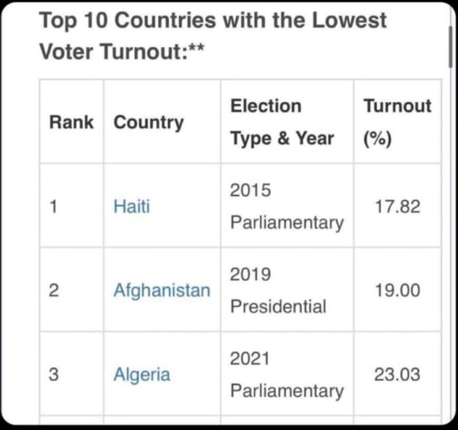 Quoi qu’il en soit, le record historique établi par le pays ne change pas pour autant : ce scrutin demeure devant Haïti et l’Afghanistan en termes de plus faible participation de l’histoire récente.