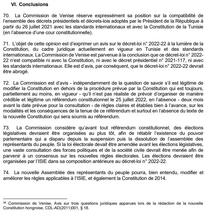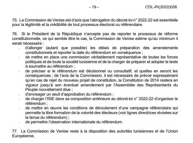 Ce qui intéresse tout particulièrement la Commission de Venise (Commission européenne pour la démocratie par le droit), dont la présidente avait pour rappel été reçue au Palais de Carthage en avril dernier, c’est le décret présidentiel 2022-22, en vertu duquel Saïed a amendé la Loi organique régissant l’Instance Supérieure Indépendante des Elections (ISIE). Mais ce n’est pas là le seul grief formulé aujourd’hui par le rapport final de la Commission.