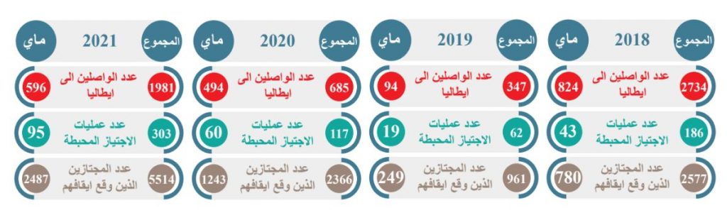 Les opérations d’interception continuent d’être basées sur l’effort de renseignement et la surveillance intensive aux entrées des villes et villages côtiers. Ainsi, le pourcentage des opérations d’interception avant d’atteindre la plage de départ est de 68,4% durant le mois de Mai 2021, lit-on de même source.