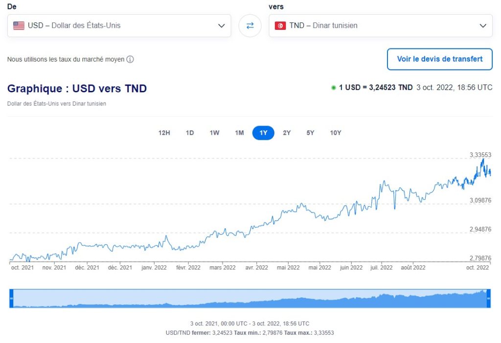 Outre un déficit préoccupant de la balance commerciale alimentaire, le cours de change a atteint fin septembre 2022 un nouveau record pour le dollar américain face au dinar tunisien : un dollar s’échangeait ainsi contre 3,33 dinars, dépassant pour la première fois la valeur de l’euro face au dinar tunisien.